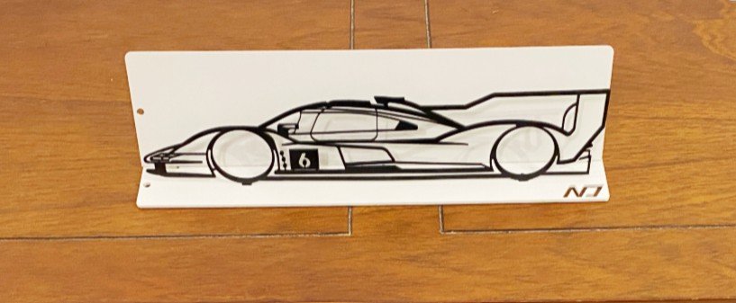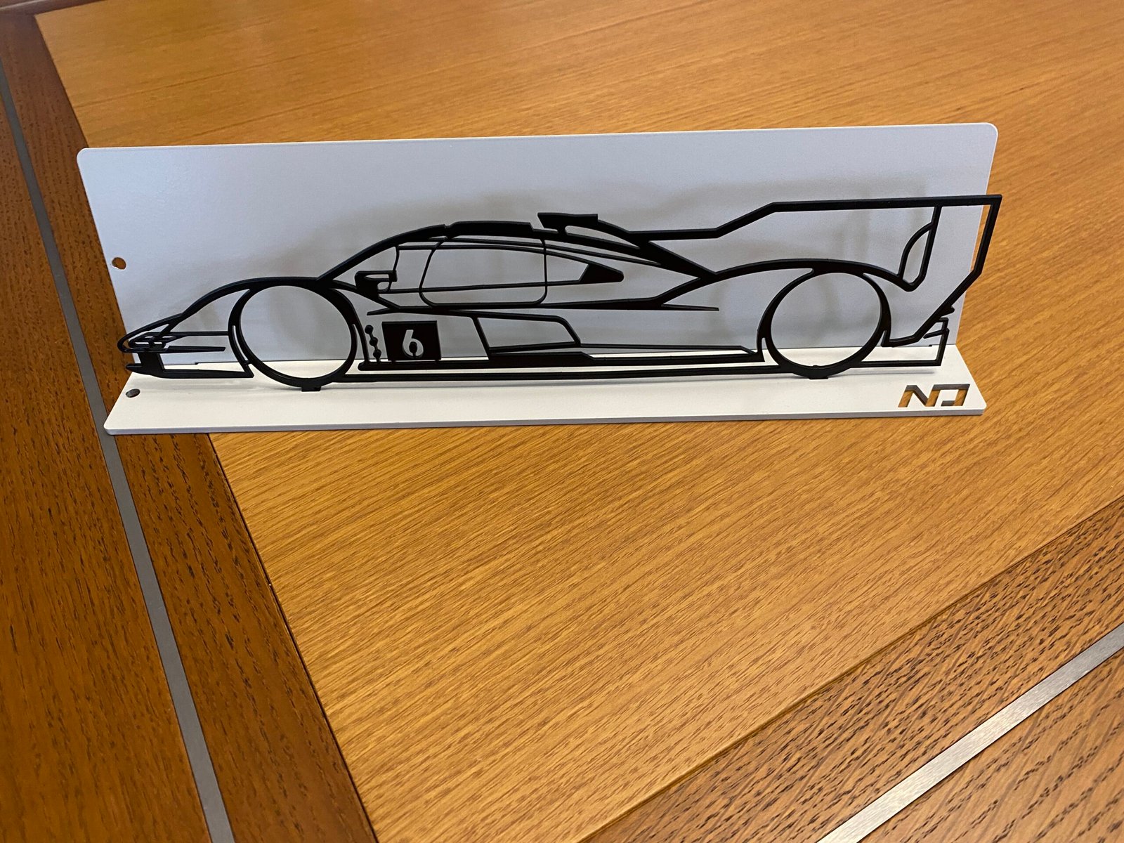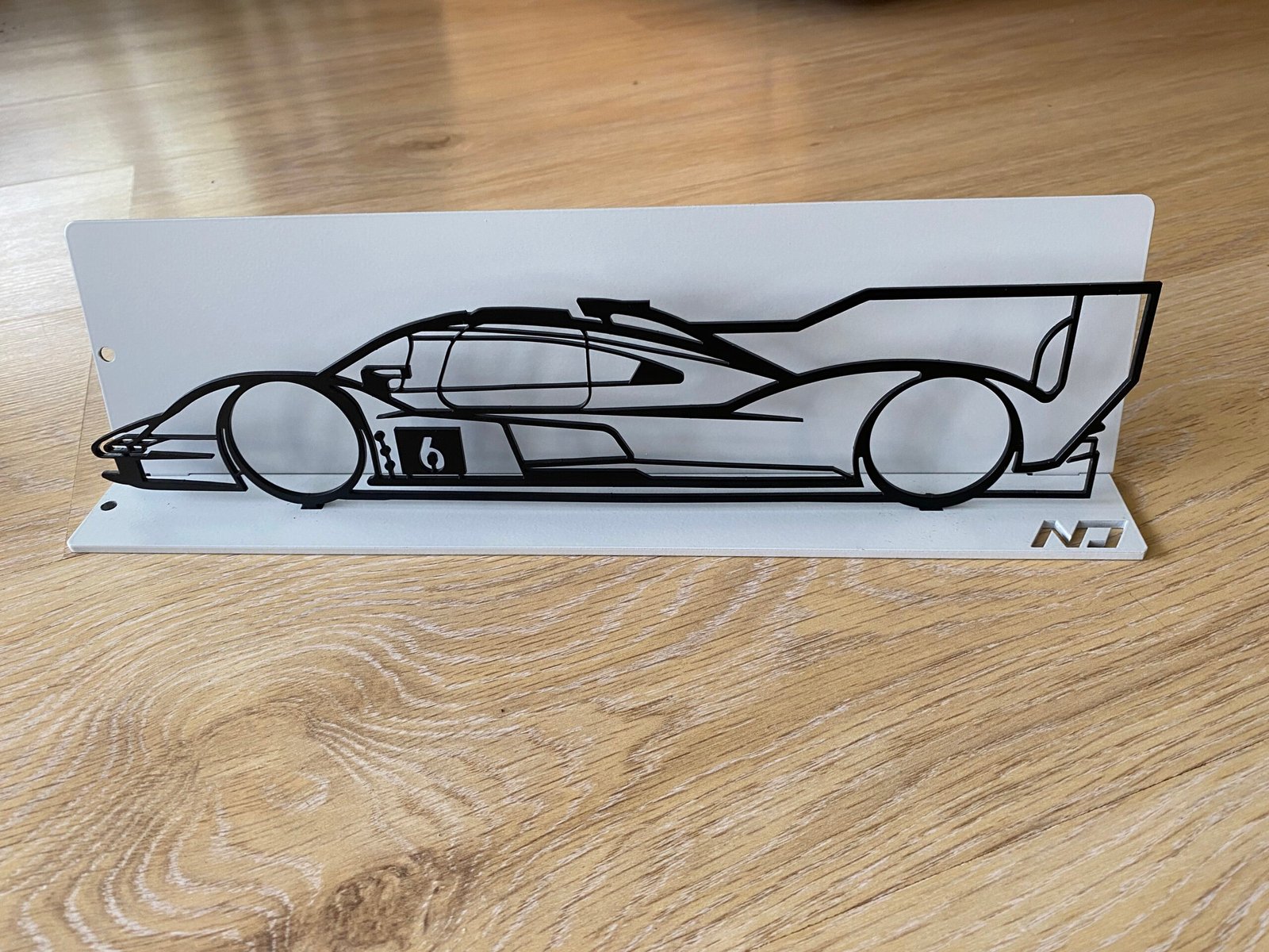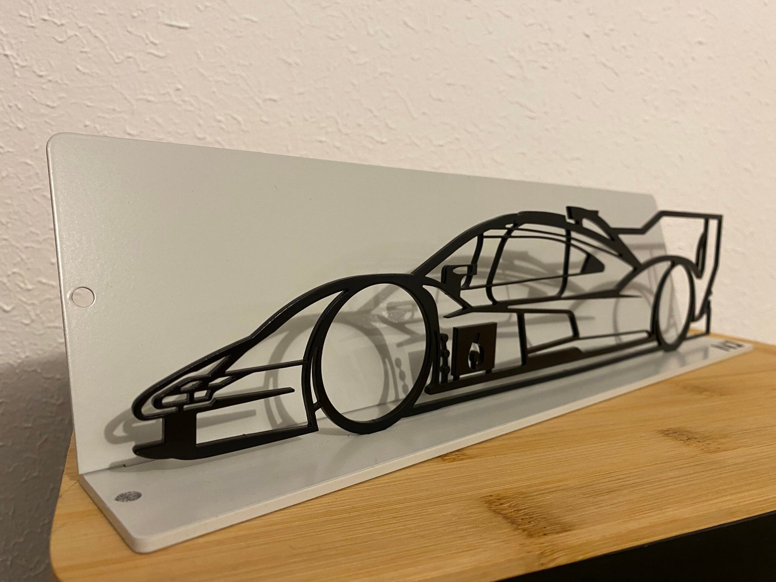 L’acier découpé au laser révèle chaque détail de sa silhouette aérodynamique, tandis que le fond gris clair crée un véritable écrin autour de la silhouette noire et offre un contraste subtil pour un effet 3D élégant.